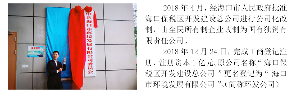 海口市環境發展有限公司是海口市屬國有獨資有限責任公司,于2018年12月正式掛牌運營,注冊資本1億元,由1993年12月成立的海口保稅區開發建設總公司進行公司化改制而成,核心業務為環境環衛產業投資和運營、資產運營和管理,培育業務為工程管理